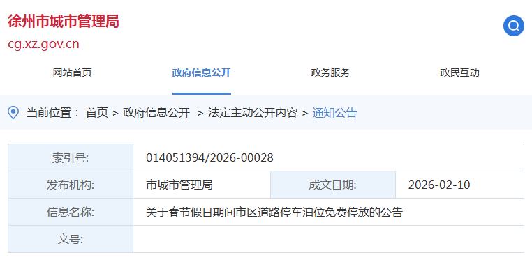 为营造欢乐、祥和的节日氛围,满足春节假日期间广大市民出行停车需求,经市政府同意,决定2026年2月15日0时至2026年2月23日24时(共9天),市区(鼓楼区、云龙区、泉山区、经开区)所有收费道路停车泊位全部免费停放。